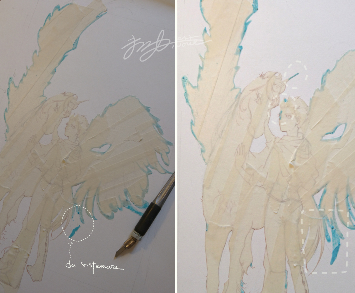 Le ali devono essere enormi e leggere, vorrei lasciarle quasi bianche con una colorazione molto fine ... inizio a mascherarle con il Molotow Masking Liquid.